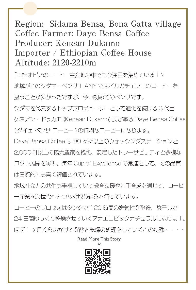 ANYではイルガチェフェのコーヒーを扱うことが多かったですが、今回初めてのベンサです。