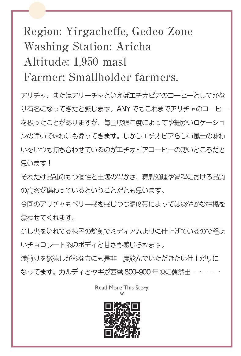 アリチャ、またはアリーチャといえばエチオピアのコーヒーとしてかなり有名になってきたと感じます。ANYでもこれまでアリチャのコーヒーを扱ったことがありますが、毎回収穫年度によってや細かいロケーションの違いで味わいも違ってきます。しかしエチオピアらしい風土の味わいをいつも持ち合わせているのがエチオピアコーヒーの凄いところだと思います!
