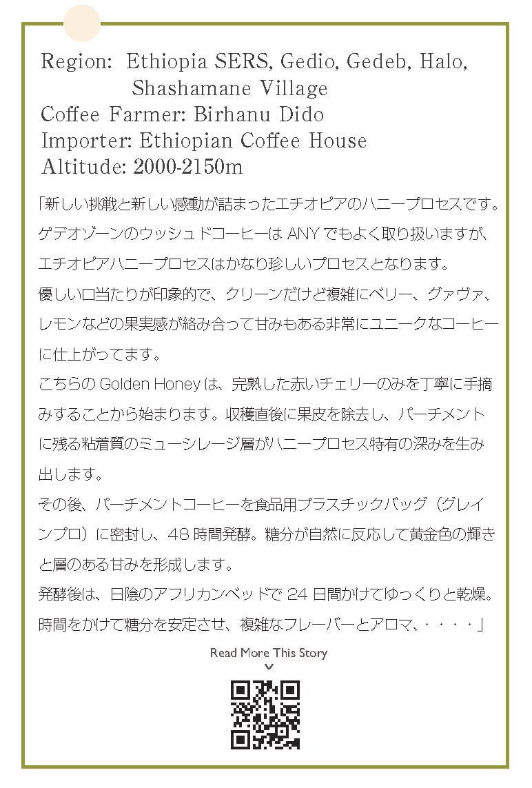 ゲデオゾーンのウッシュドコーヒーはANYでもよく取り扱いますが、エチオピアハニープロセスはかなり珍しいプロセスとなります。
